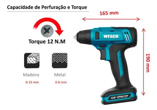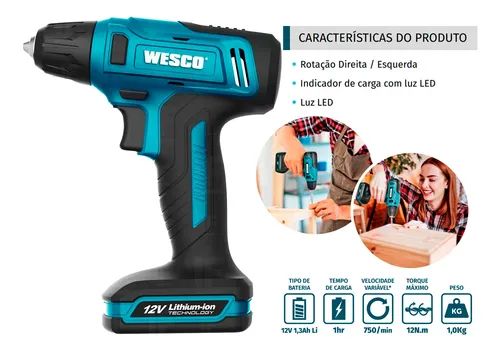 Parafusadeira/Furadeira Bateria 12V 1.3Ah Li-Ion3/8 Pol Acessórios WESCO-WS2555K